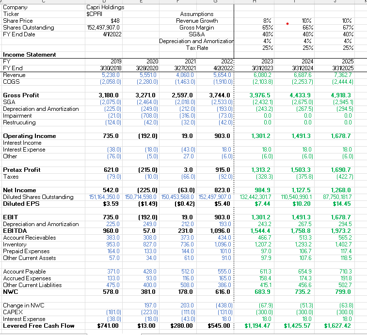 Yes, these are extremely aggressive assumptions. But management tends to go big with capital allocation when push comes to shove. They outbid Kering and Tiffany in 2018 for Versace, along with beating Coach and private equity for Jimmy Choo in 2017.In both instances, they weren’t the biggest dog in the fight, but they weren’t afraid of using their teeth. No matter the stakes, John Idol and Thomas Edwards are not afraid of shoving all their chips in the middle when they sense opportunity. If they truly believe CPRI is undervalued as they say it is, I expect them to repurchase shares at a rapid rate. Applying a 15x earnings multiple to FY 2025 EPS projection of $14.45, I get a share value of $216, or four times the company’s current values. I’m going purchase $9,500 at these levels.