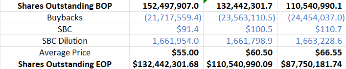Using my assumptions, the company will generate more than $5 billion in levered free cash flow over the next three years. if they spend all of this cash flow on repurchasing shares, they could easily retire 1/3 of the float.